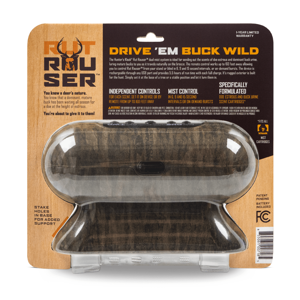 The provided USB cable recharges the battery while the battery is in the unit. The average life of a fully-charged battery is approximately 5.5 hours with a recharge rate of 4.5 hours to full charge. The unit is operable at temperatures as low as 14°F (-10C°). The unit can use any combination of Hunter’s Kloak® Scents. The variety of 2.5-ounce scent cartridges are mess-free, easy to install, and are interchangeable while on the hunt. Each scent cartridge last approximately 4.5 hours. The Hunter’s Kloak® Rut Rouser Dual Mister comes with a remote, charging cable, and battery. Scent cartridges are not included.