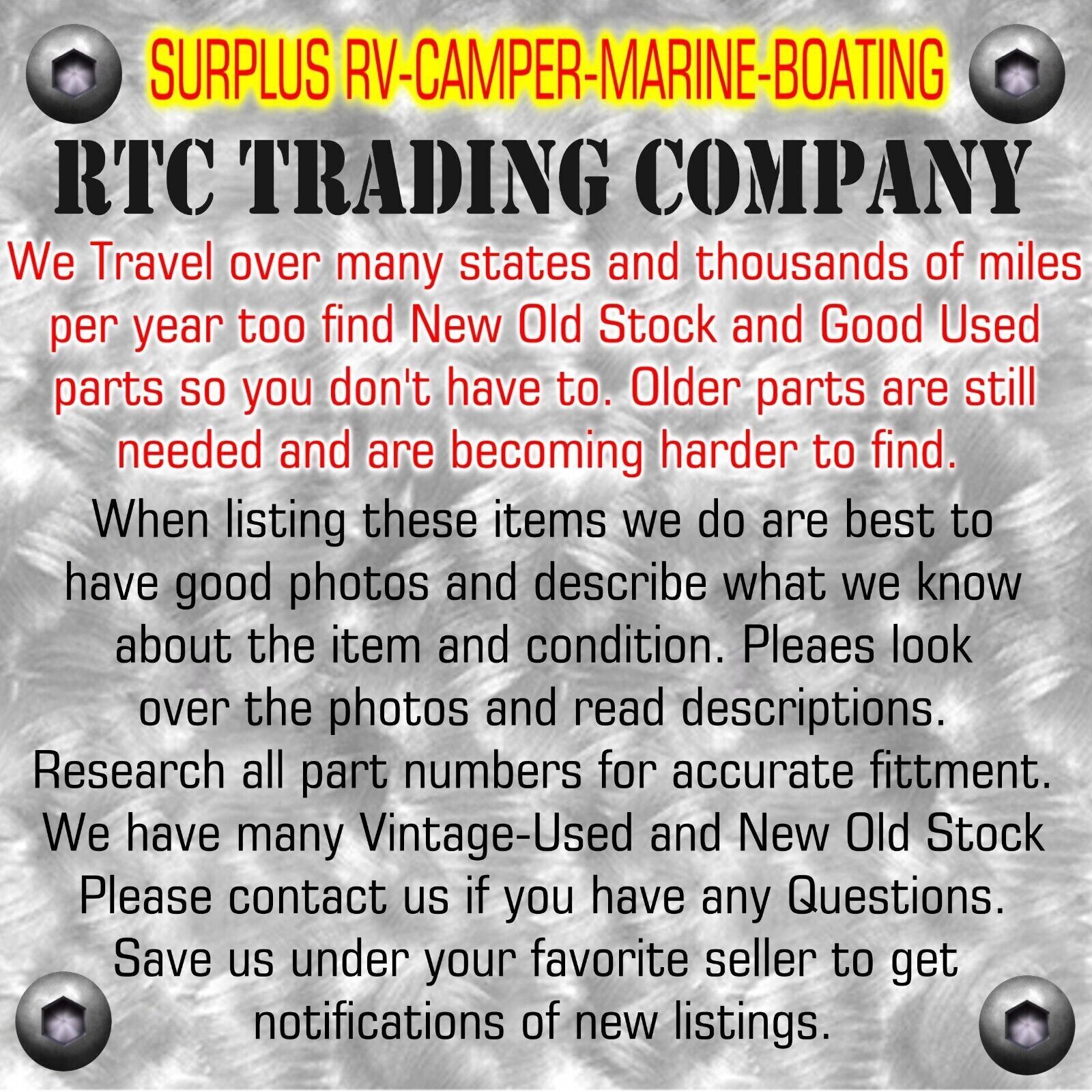 RTC Trading Company: We buy out many stores that close and end up with lots of surplus Auto, Truck, Motorcycle and Marine Parts.