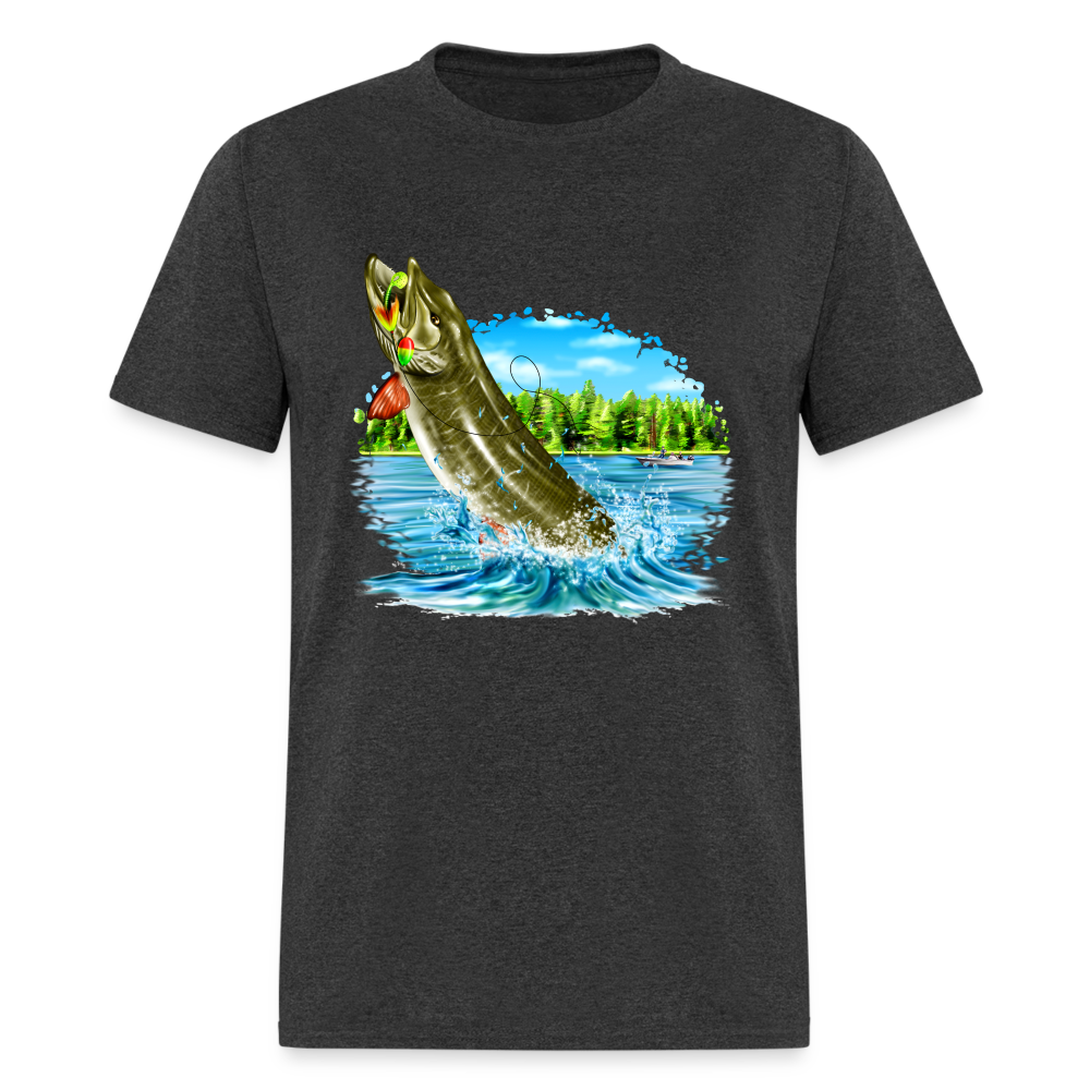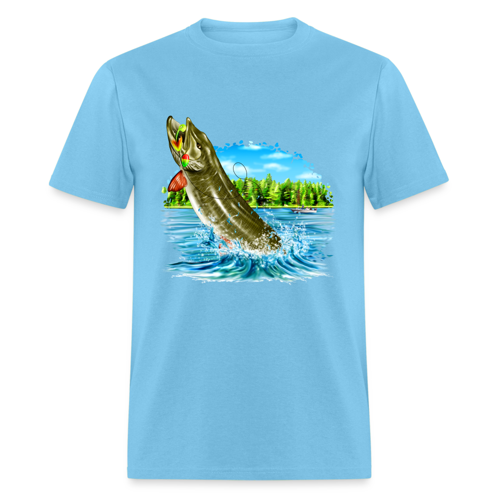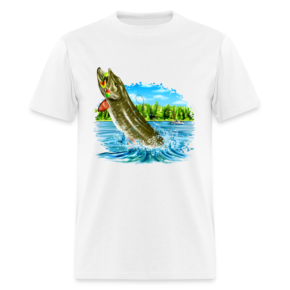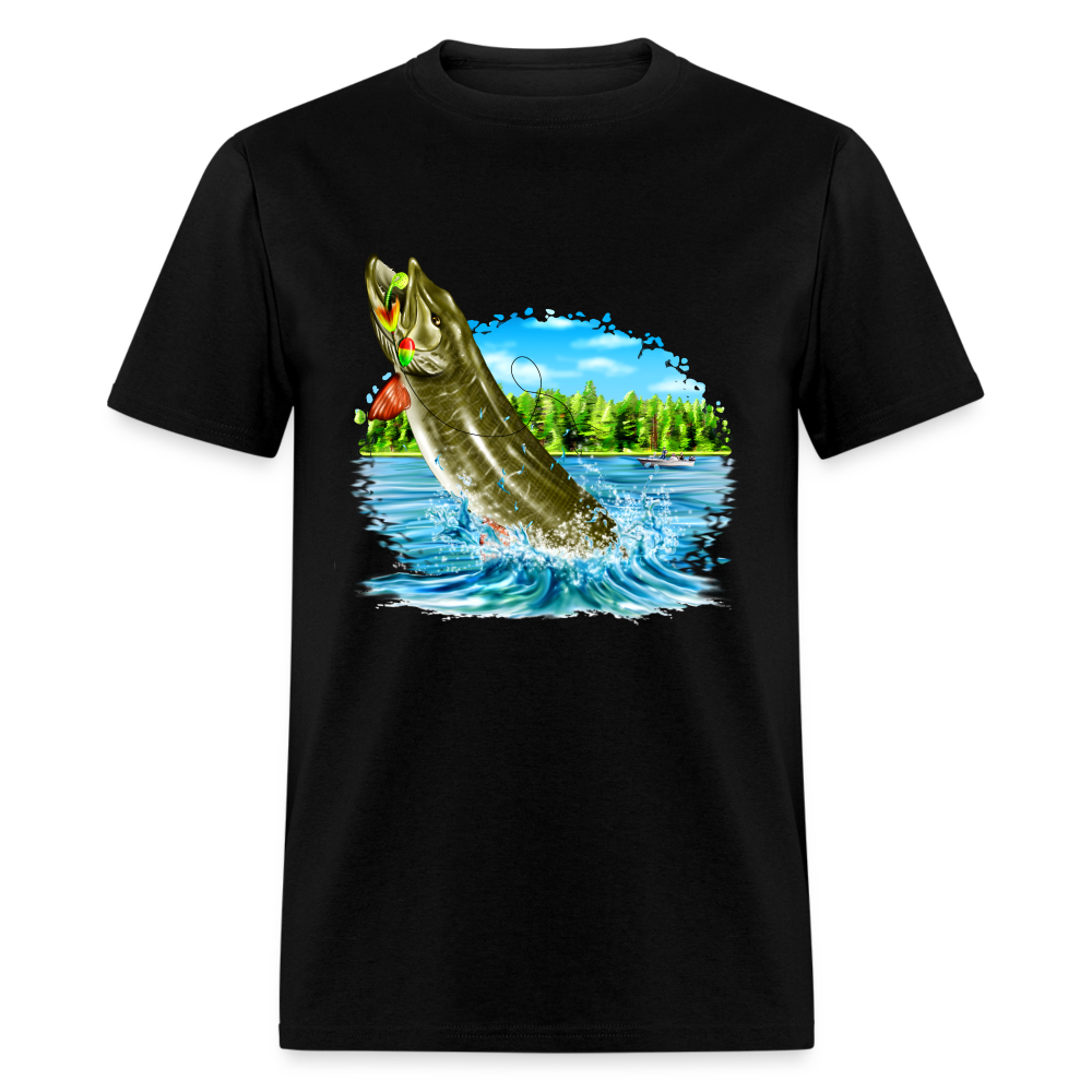 Muskie fishing lake and fisherman. High quality art design tee shirts.