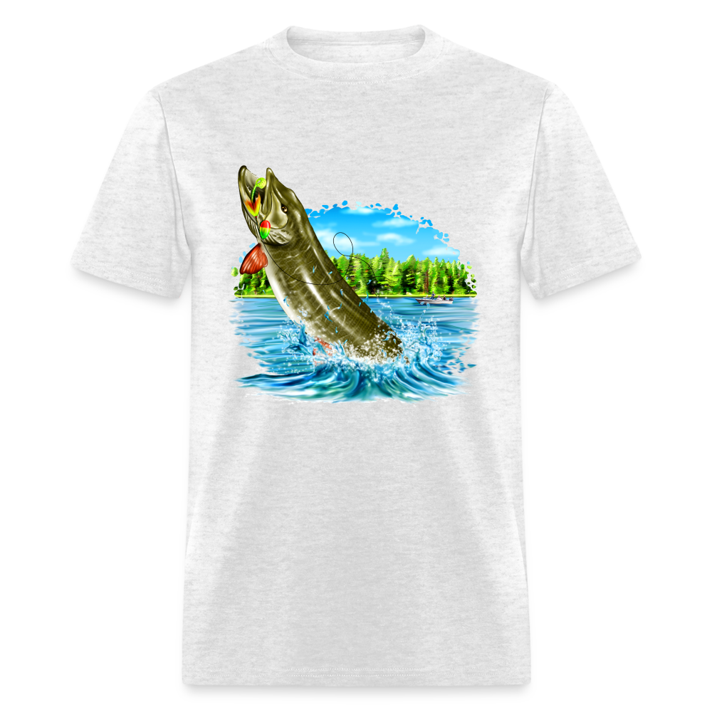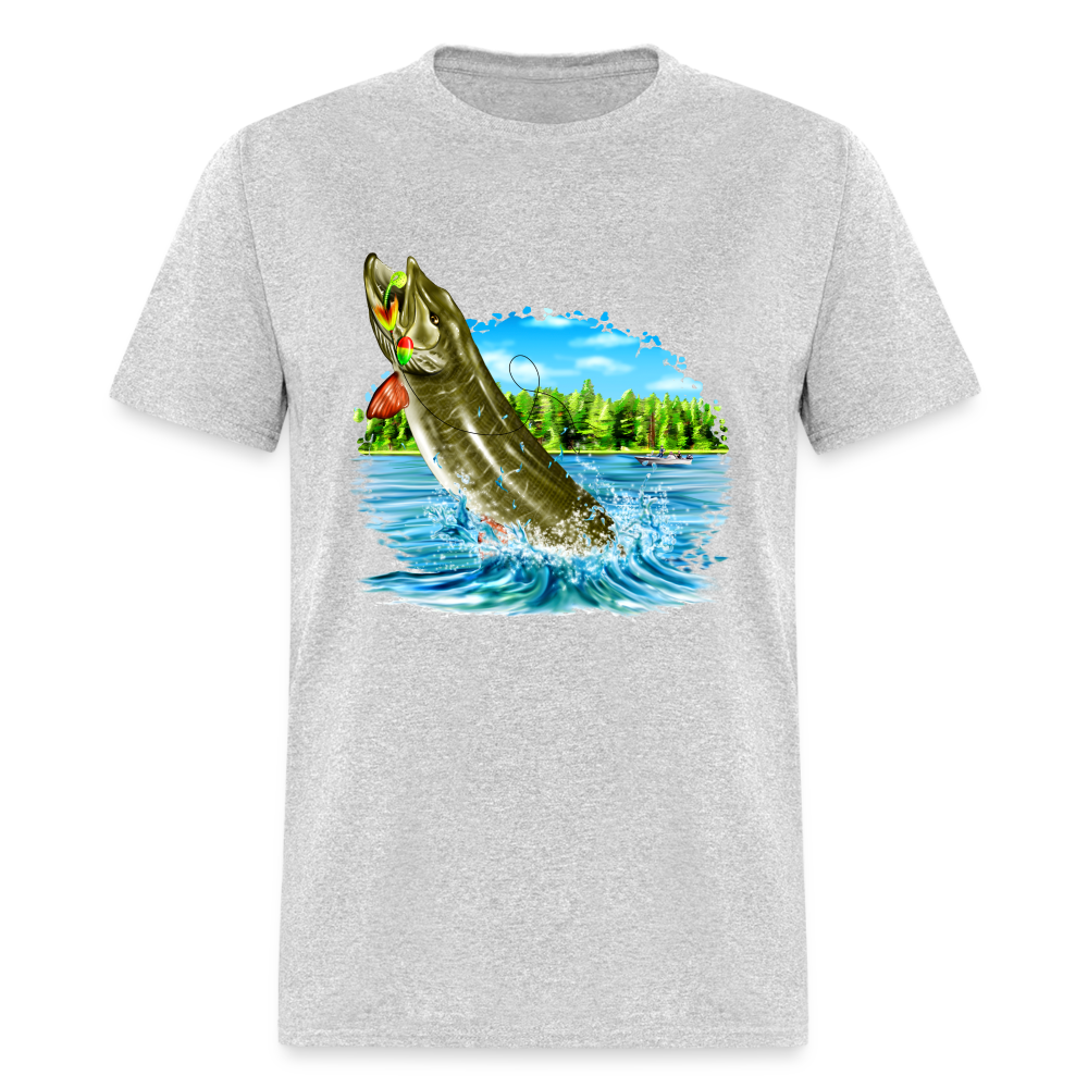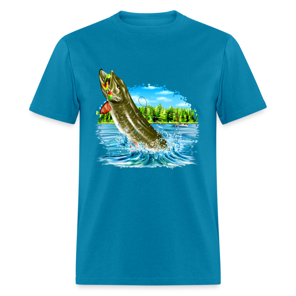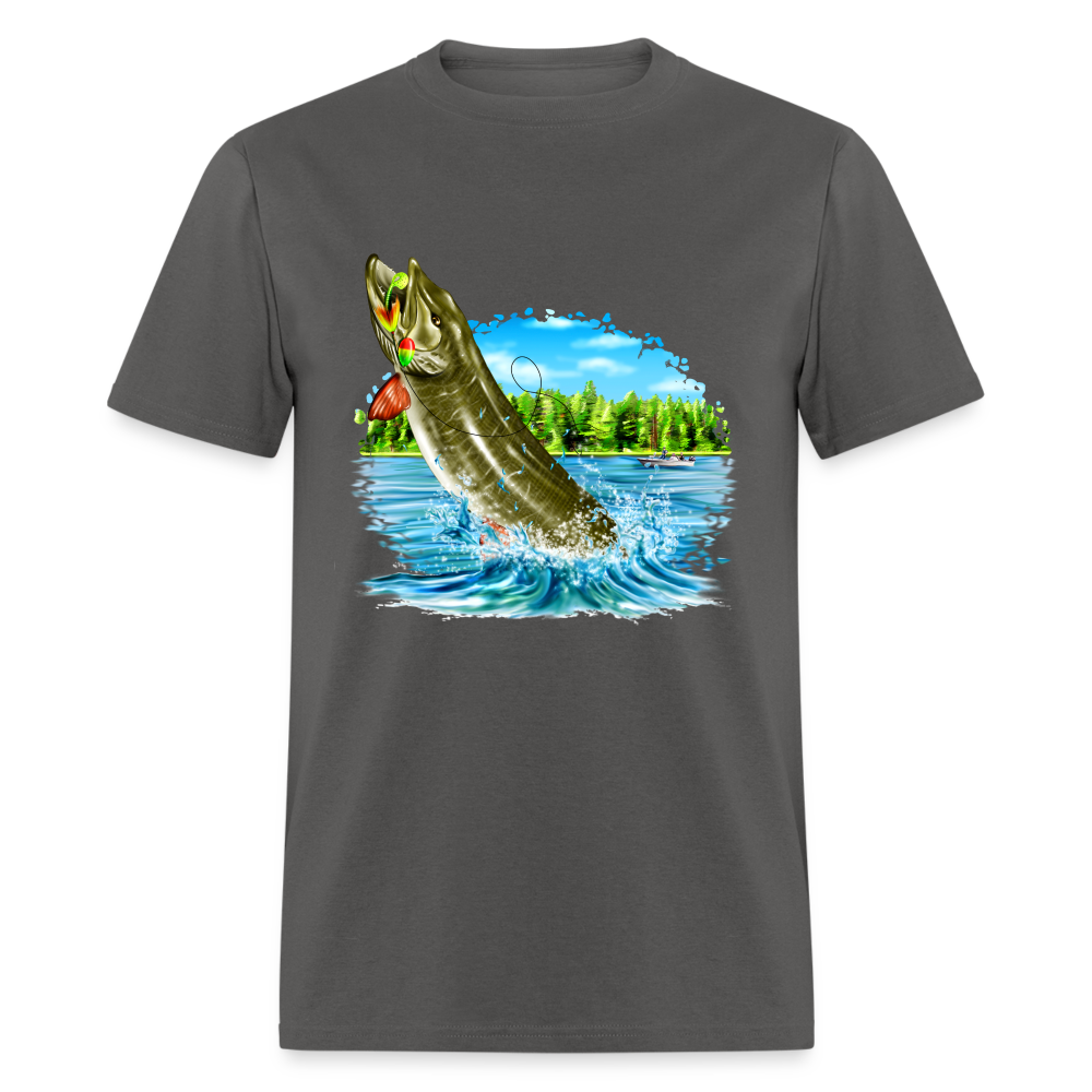 Muskie fishing lake and fisherman. High quality art design tee shirts.