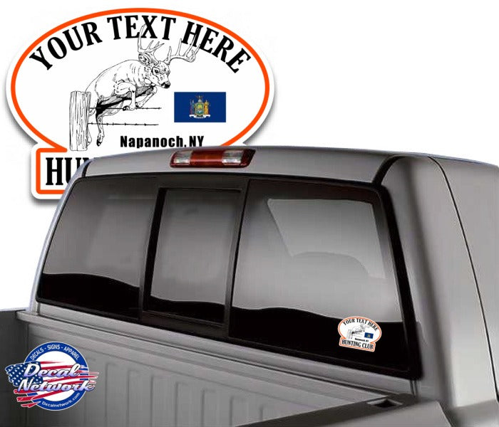 This is our very popular 3"x 4" oval hunting club decal. Now you can design and preview it live as you add your custom text and flag. Change the color of the border and the color of the text. Purchase Bulk for more discounts. Contact us for custom request.